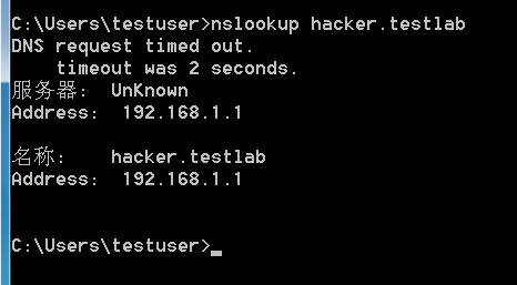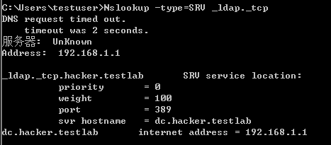 然后就可以通过反向解析命令nslookup来解析域名的IP地址,用解析得到的IP地址进行对比,判断DC和DNS服务是否在同一台服务器上。