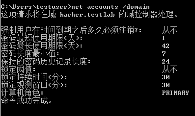 如下命令可以获取域密码策略、密码长度、错误锁定等信息: