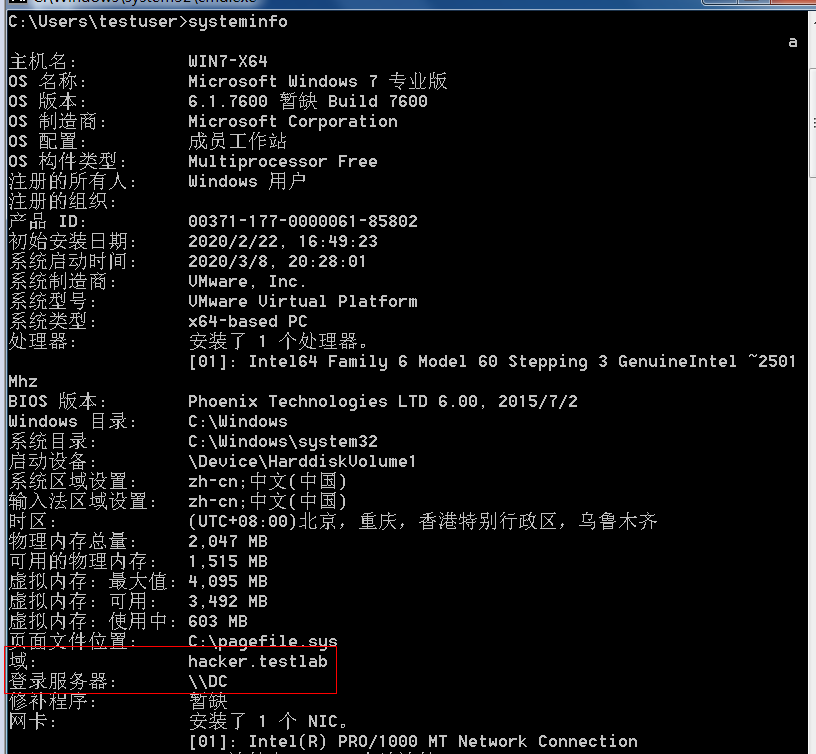 获得本机相关信息之后,就要判断当前内网中是否存在域。如果当前内网存在域,则需要判断所控主机是否在域内。