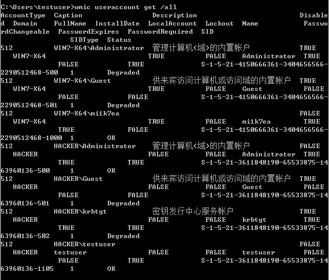 如下命令可获取域内用户的详细信息,包括用户名、描述信息、SID、域名、状态等: