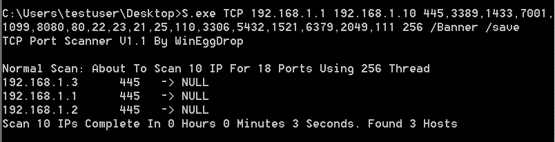 1 | S.exe TCP 192.168.1.1 192.168.1.254 445,3389,1433,7001,1099,8080,80,22,23,21,25,110,3306,5432,1521,6379,2049,111 256 /Banner /save |
