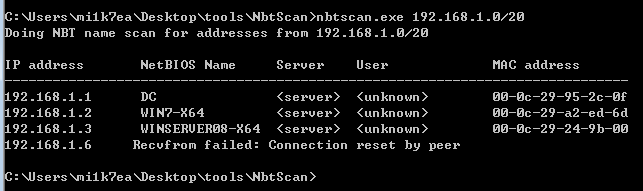 将nbtscan上传到内网目标主机,然后直接在指定目标IP段进行扫描即可: