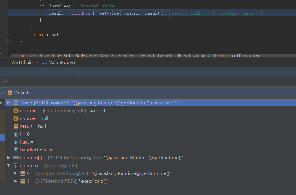 跟下去,就是调用的ASTChain.getValueBody()函数,这里会循环解析ASTChain中每个节点的表达式,这里有两个子节点,首先会解析第一个节点即`@java.lang.Runtime@getRuntime()`这个OGNL表达式: