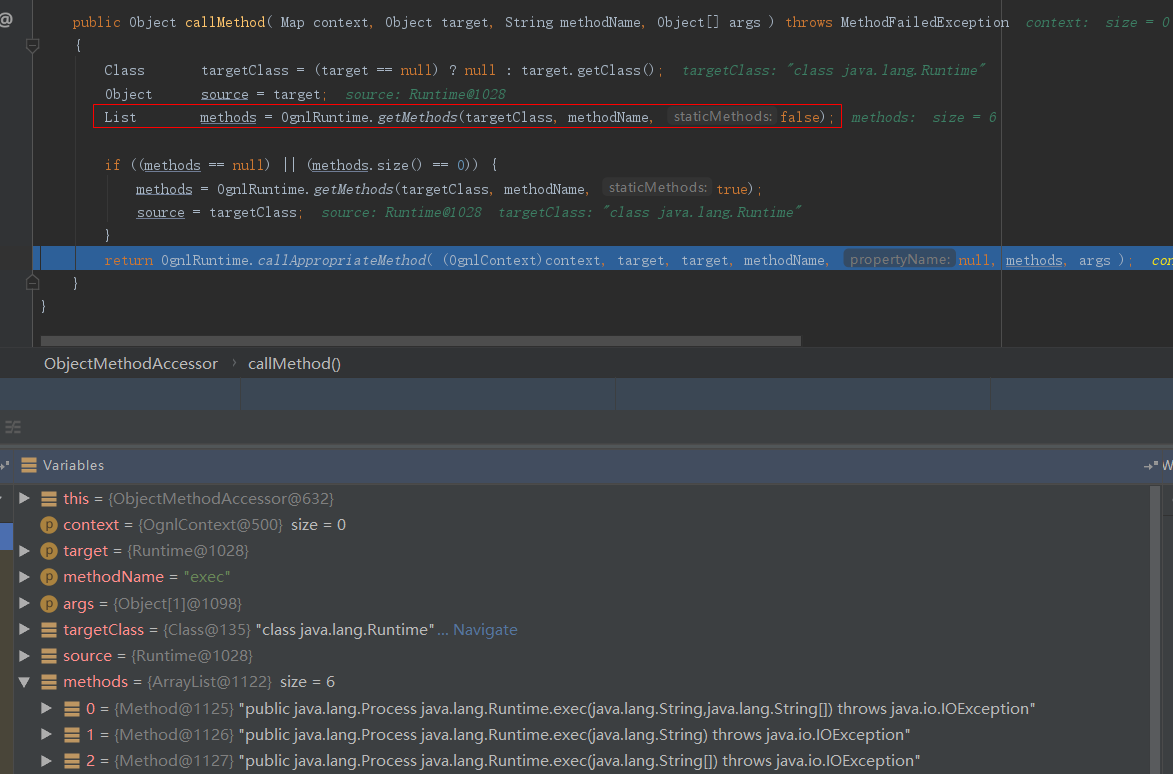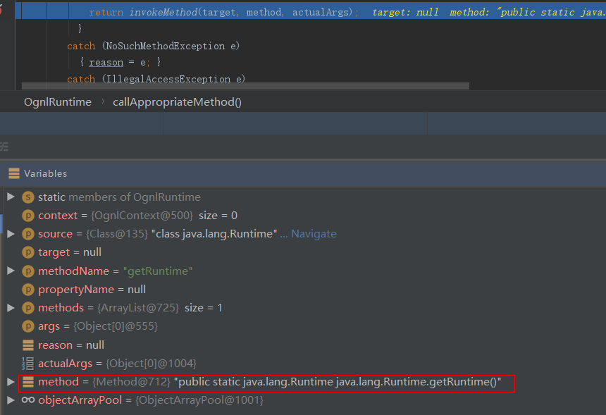 往下,调用OgnlRuntime.getMethods()函数获取到java.lang.Runtime类的getRuntime()方法后,进一步调用OgnlRuntime.callAppropriateMethod()函数进行解析: