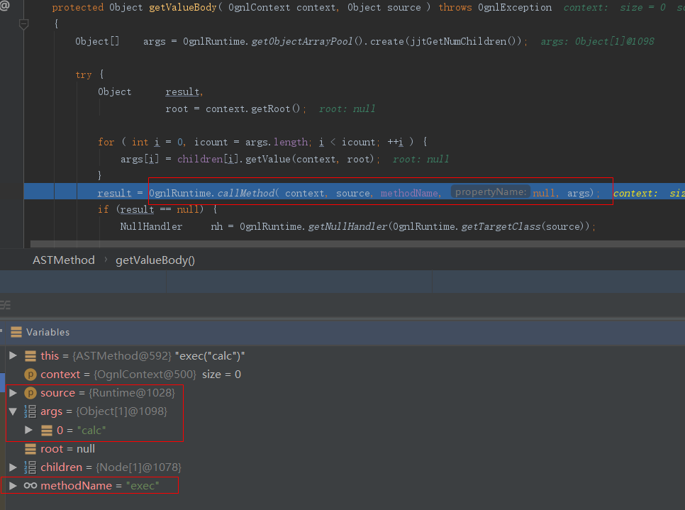 后面的解析过程和解析第一个子节点的时候几乎是一样的。在调用OgnlRuntime.callMethod()函数时,参数source为前面解析第一个子节点表达式时得到的Runtime类,另外两个参数则为分辨出的方法名和参数值: