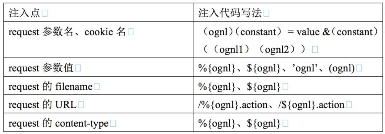 HTTP请求中常见的注入点如下表(来自Struts2著名RCE漏洞引发的十年之思):