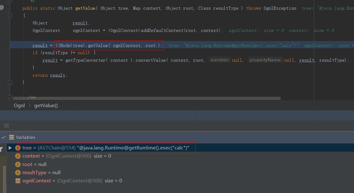 这里简单调试分析下Ognl.getValue()解析OGNL表达式到执行命令的过程。
