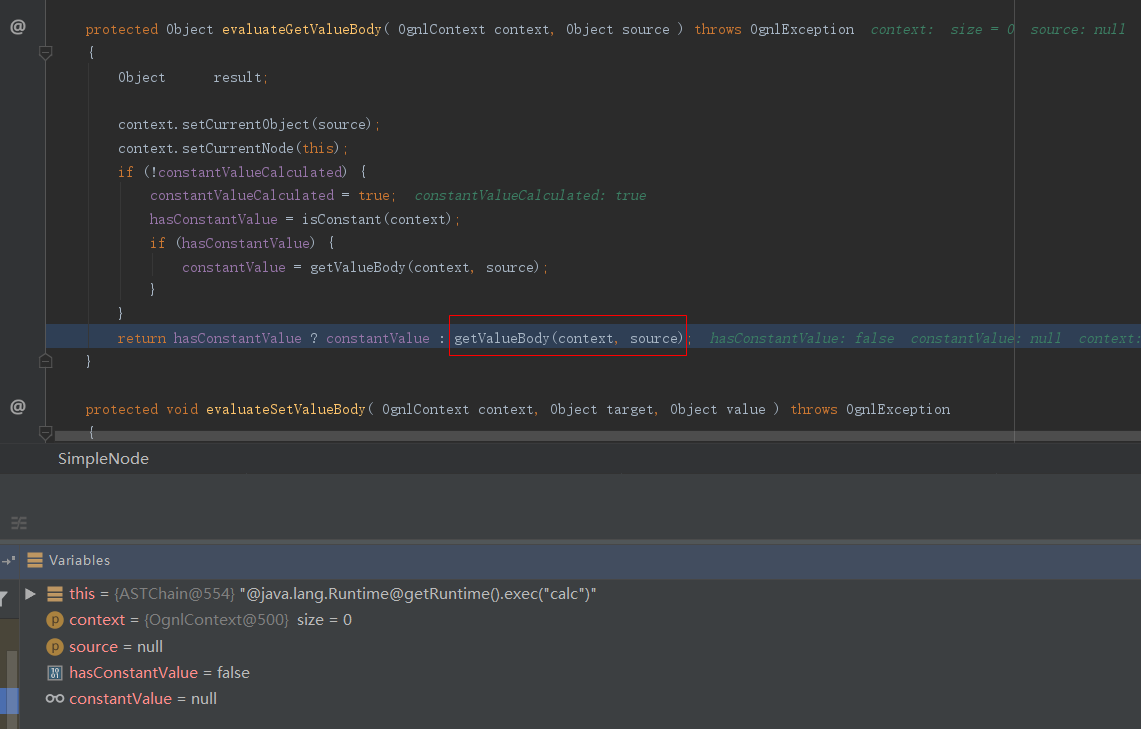 由于tree变量就是表达式解析来的东西,因此接下来的调用中局部环境中的this变量的值就是我们的OGNL表达式的内容。往下就是调用的SimpleNode.getValue()函数,其中调用了evaluateGetValueBody()函数: