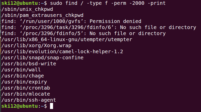 同样的,具备sgid权限的二进制文件,表示在执行过程中会获取二进制文件所属group权限,查找命令如下,对列出的文件逐个确认即可: