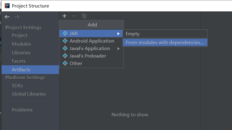 Artifacts –> + –> JAR –> From modules with dependencies:
