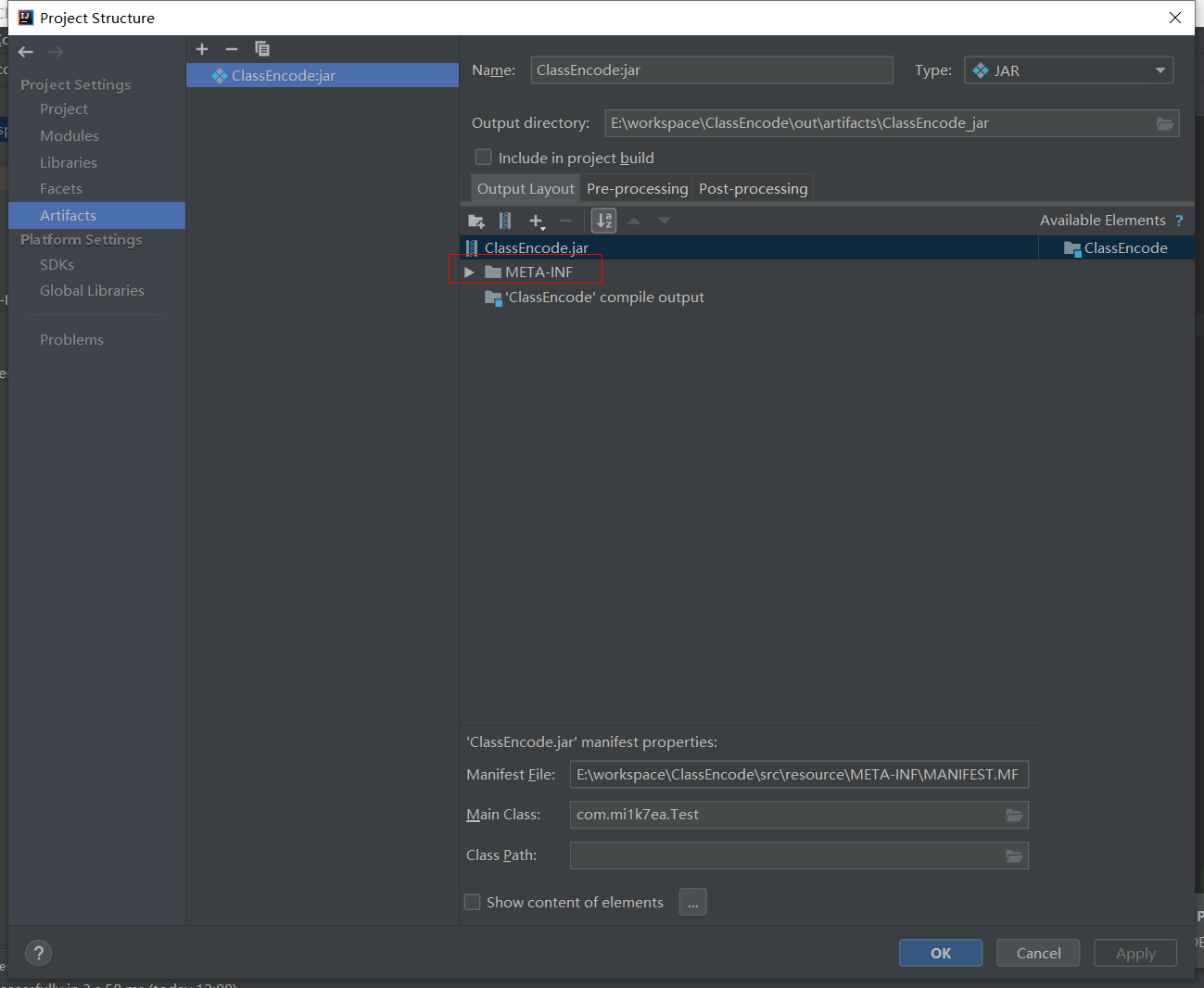 设置完之后,此时应该也必须有META-INF此文件,不然会运行错误。若JAR files from libraries选择src/main/resources目录,是没有META-INF文件的。Output directory是jar包的保存目录: