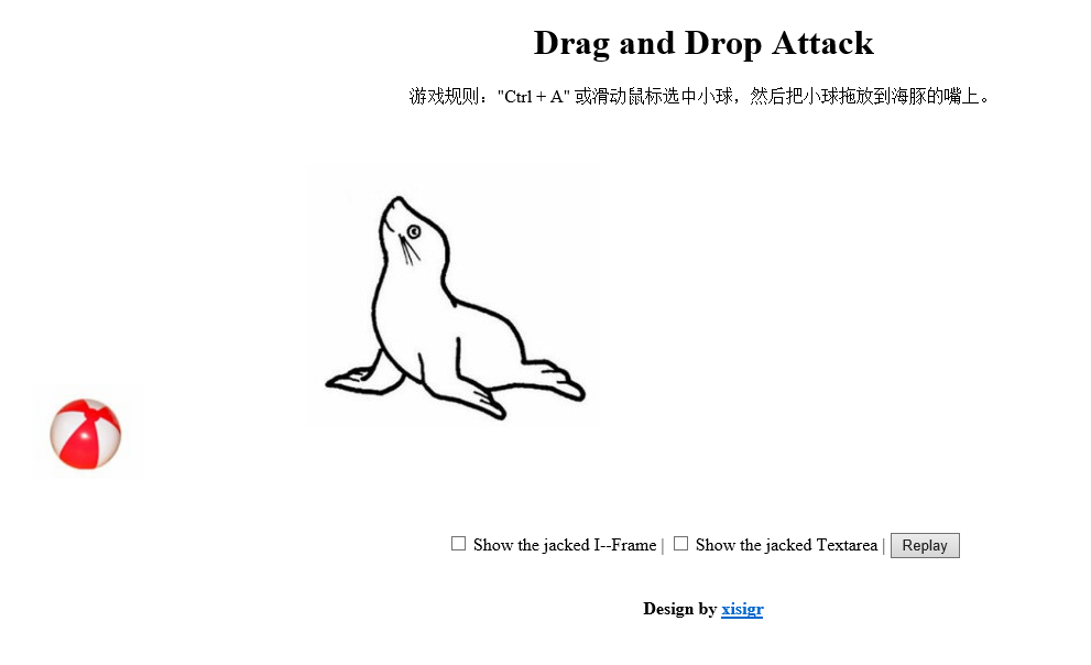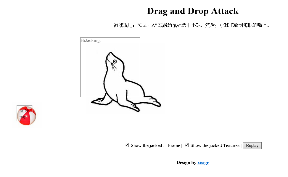 可以看到,小球下面隐藏的就是目标框,而海狮嘴上周围隐藏的是攻击者劫持用的框。当用户鼠标点击小球,即点中了隐藏的目标框,然后Ctrl+A就会选中隐藏的目标框中所有内容,再拖动小球到海狮嘴上的过程中就会把隐藏的目标框中所有的信息拖到攻击者的框中,从而完成拖放劫持攻击: