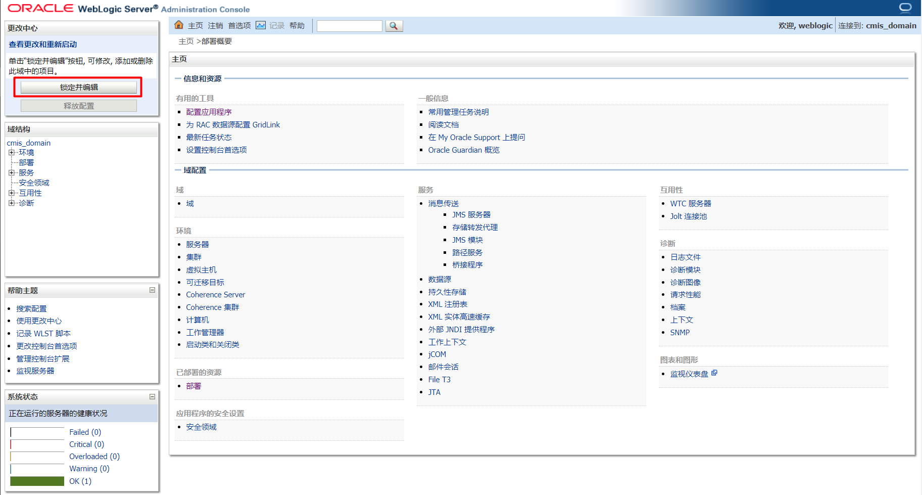 弱口令登录WebLogic控制台,点击”锁定并编辑”: