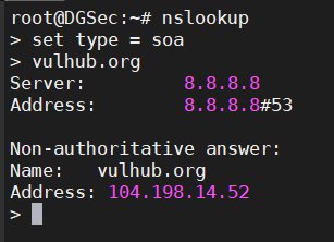 正常来说,dig解析vulhub.org域名结果如下,其中指定8.8.8.8的DNS服务器是不存在域传送漏洞的: