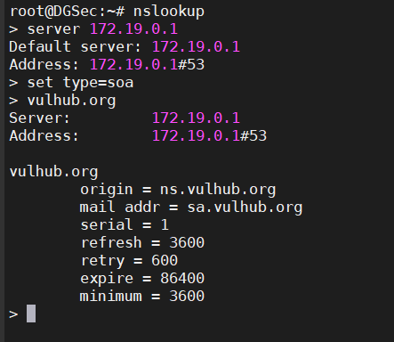 运行了漏洞靶机后,docker容器的53端口和宿主机是绑定的,也就是说这个存在域传送漏洞的DNS服务器写宿主机的IP即可。