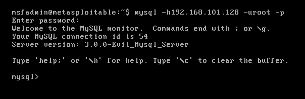 开启恶意MySQL服务后,受害者尝试使用MySQL客户端连接恶意服务端(这里metasploitable机子的MySQL版本为5.0.51a-3ubuntu5,无需添加--enable-local-infile选项即可成功):