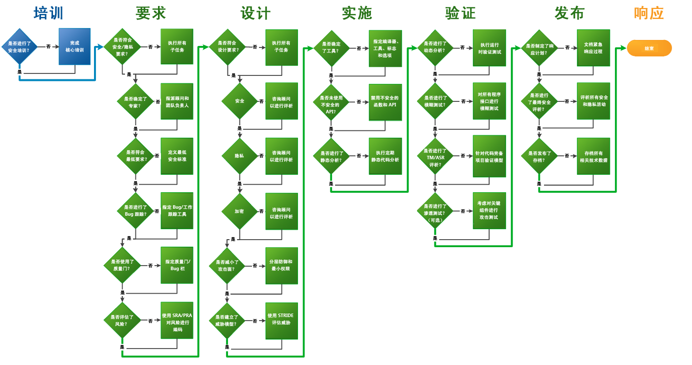 SDL的核心理念就是将安全考虑集成在软件开发的每一个阶段:需求分析、设计、编码、测试和维护。从需求、设计到发布产品的每一个阶段每都增加了相应的安全活动,以减少软件中漏洞的数量并将安全缺陷降低到最小程度。