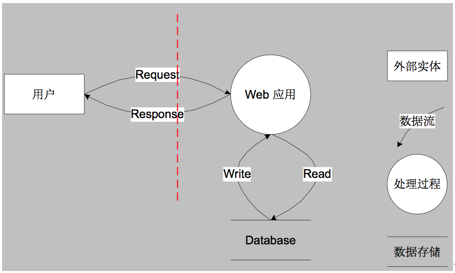 网上一个简单的Web应用数据流图如下,注意要用红色虚拟隔离出信任边界: