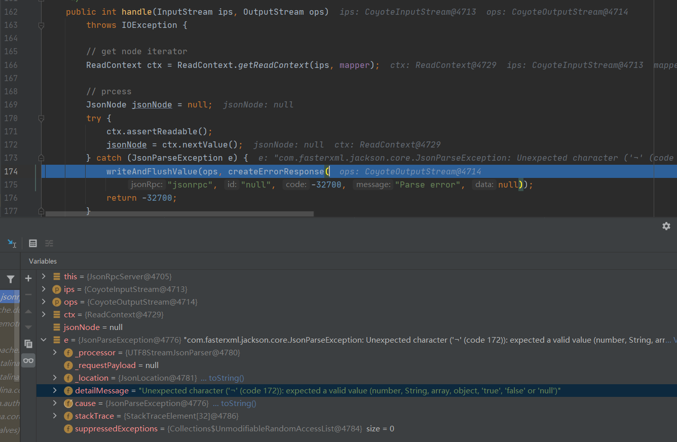 这里换个2.7.5版本测试。由于JsonRpcServer.handle()中无法处理Java序列化数据,因此是不存在类似Spring的HttpInvokerServiceExporter类中的反序列化漏洞的: