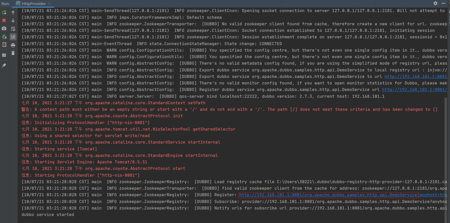 正常跑起来,其中会显示Dubbo Provider注册到Register中的HTTP服务名: