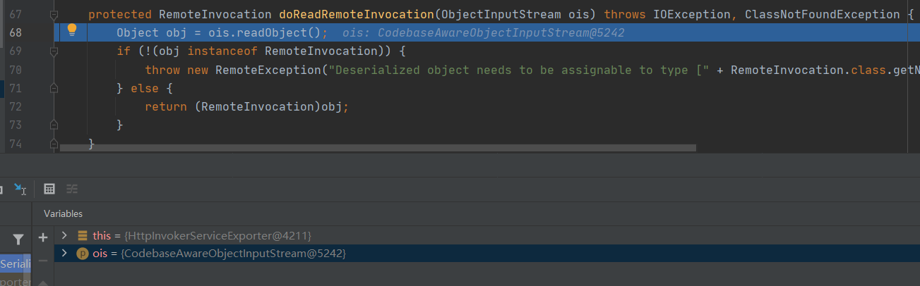根据前面的报错栈信息,在HttpInvokerServiceExporter类的readRemoteInvocation()函数中打上断点直接调试。